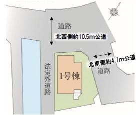 - 北西側10.5m公道 ,北東側4.7m公道