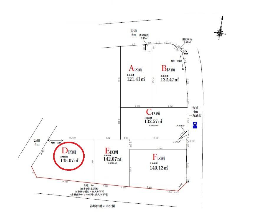 - ・現況有姿売買・地盤調査及び地盤改良は買主負担 ・水道分担金は買主負担・3階建て及び片流れ屋根は建築不可 ・清掃施設持分あり(2.32平米×1/6) ・共用部分あり(C区画とE区画) ・南側約4m公道は自歩専指定区域の為、車両の通行及び出入り不可 ・総開発面積:816.08平米 ・敷地内に電柱及び支線が入ります