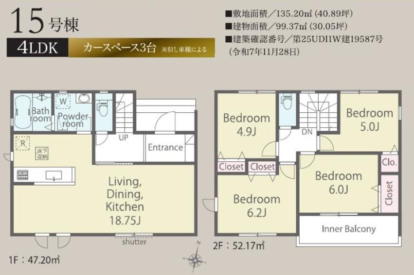 【仲介手数料無料!】新築住宅がお得に買える・埼玉相互住宅では新築購入仲介手数料が無料・スーモ・アットホーム・ホームズなど各不動産情報サイトに掲載している越谷市・川口市・草加市・八潮市・春日部市・松伏町の新築物件情報の95%が仲介手数料無料です。 15号棟 全居室に収納がある4LDK!広々18.7帖のリビング空間!キッチン・洗面・浴室がまとまった水回り動線で、家事の移動もスムーズです。駐車スペース3台可(車種による)