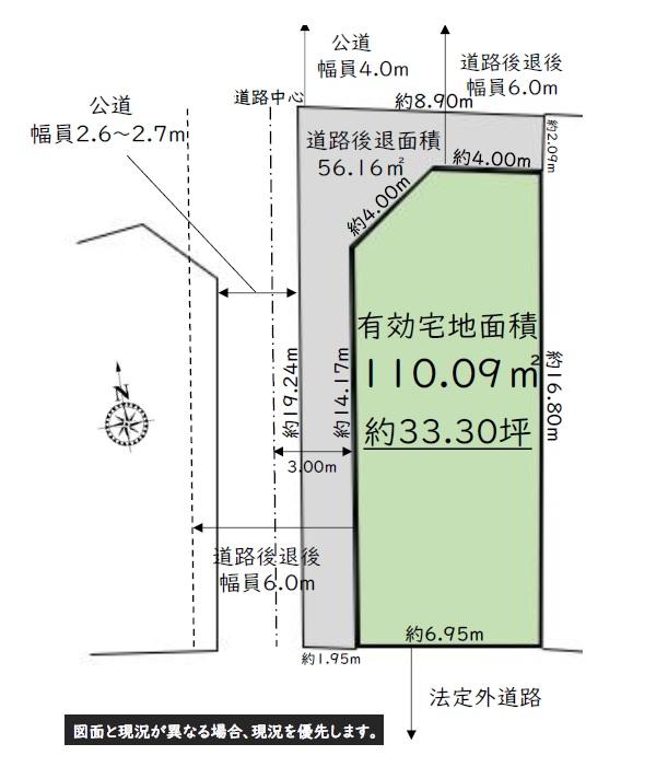 - ・農業振興地域の農用地(農地法許可要・青字) ・道路後退(分筆登記後)の有効宅地面積 110.09(約33.30坪)予定 ・道路後退面積56.16予定 ・農地転用及び開発許可申請、前面配管からの 給水管取出し工事、水道分担金等は買主負担。 ・契約不適合責任免責