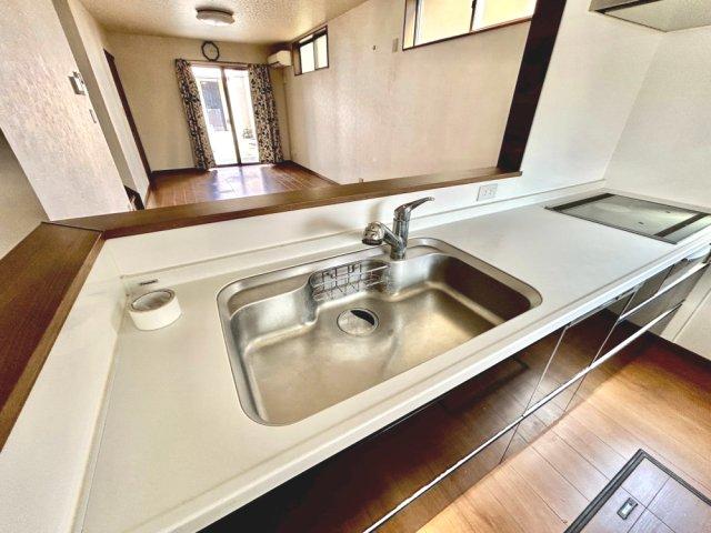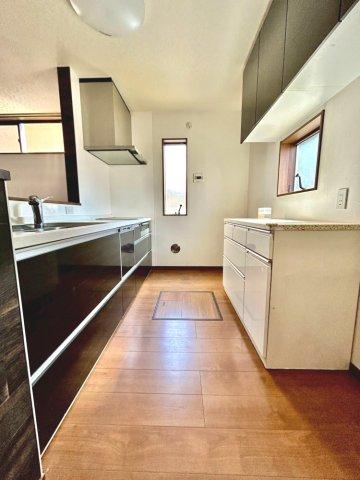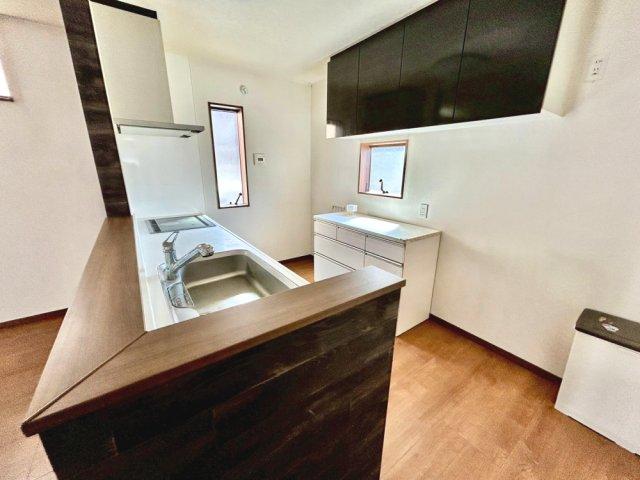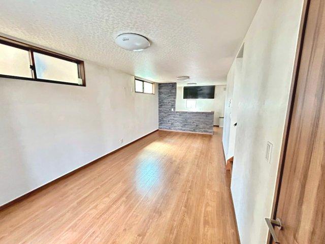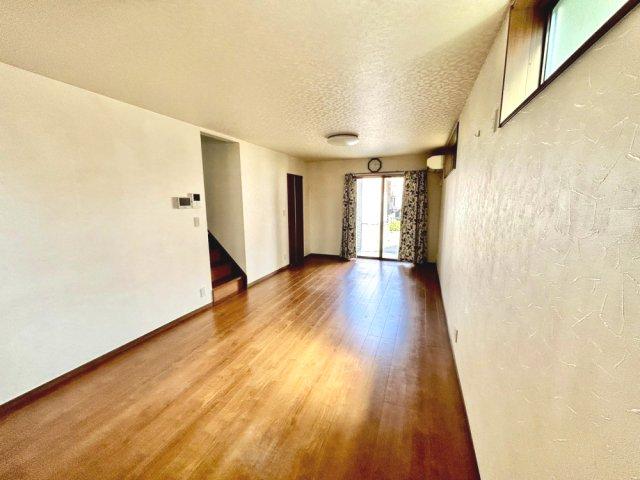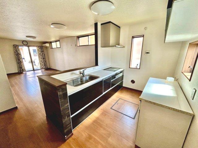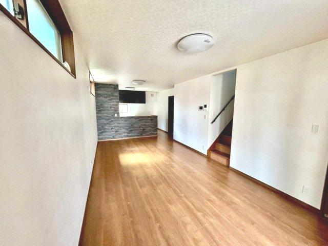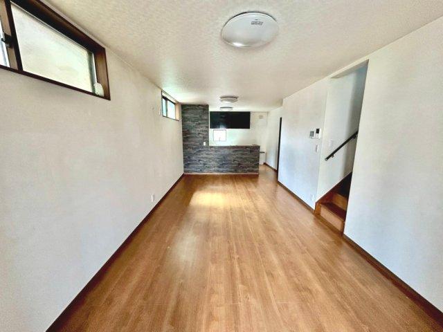 太陽光発電・蓄電池設置のオール電化住宅!広々とした18.5帖のリビング空間!リビングから階段へ続く設計で、自然と家族が顔を合わせやすくなります。キッチン・洗面・浴室がまとまった水回り動線です!