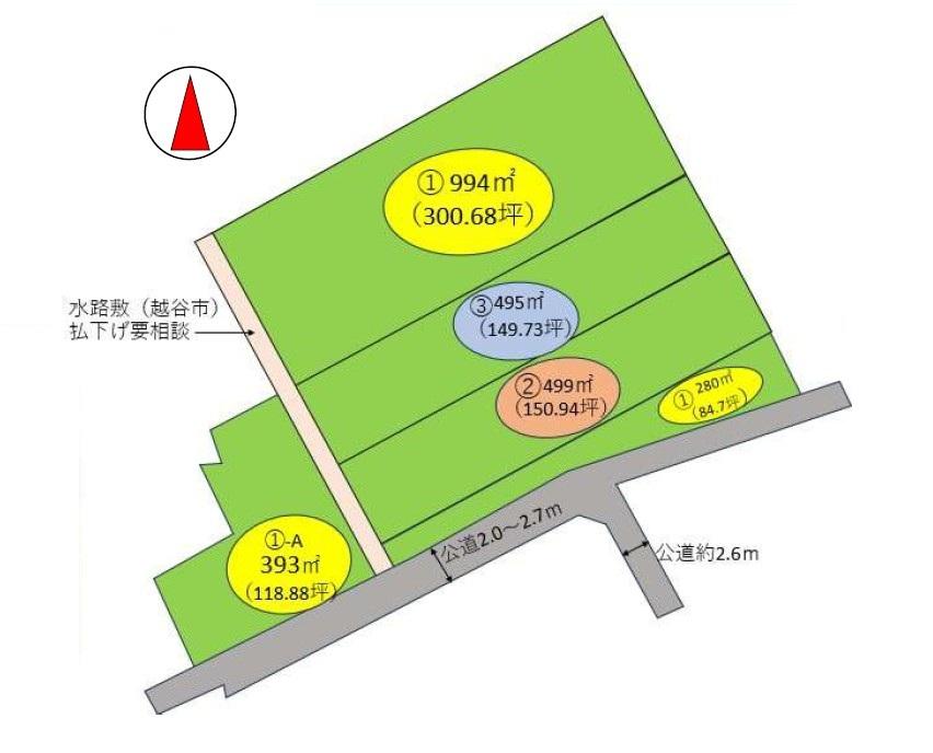 広々約804坪!資材置き場・駐車場用地としておすすめ!越谷街道方面へのアクセス良好な立地。幹線道路利用もしやすいエリアです。1-A・118坪部分については専用住宅を目的とした農地転用は可能です。